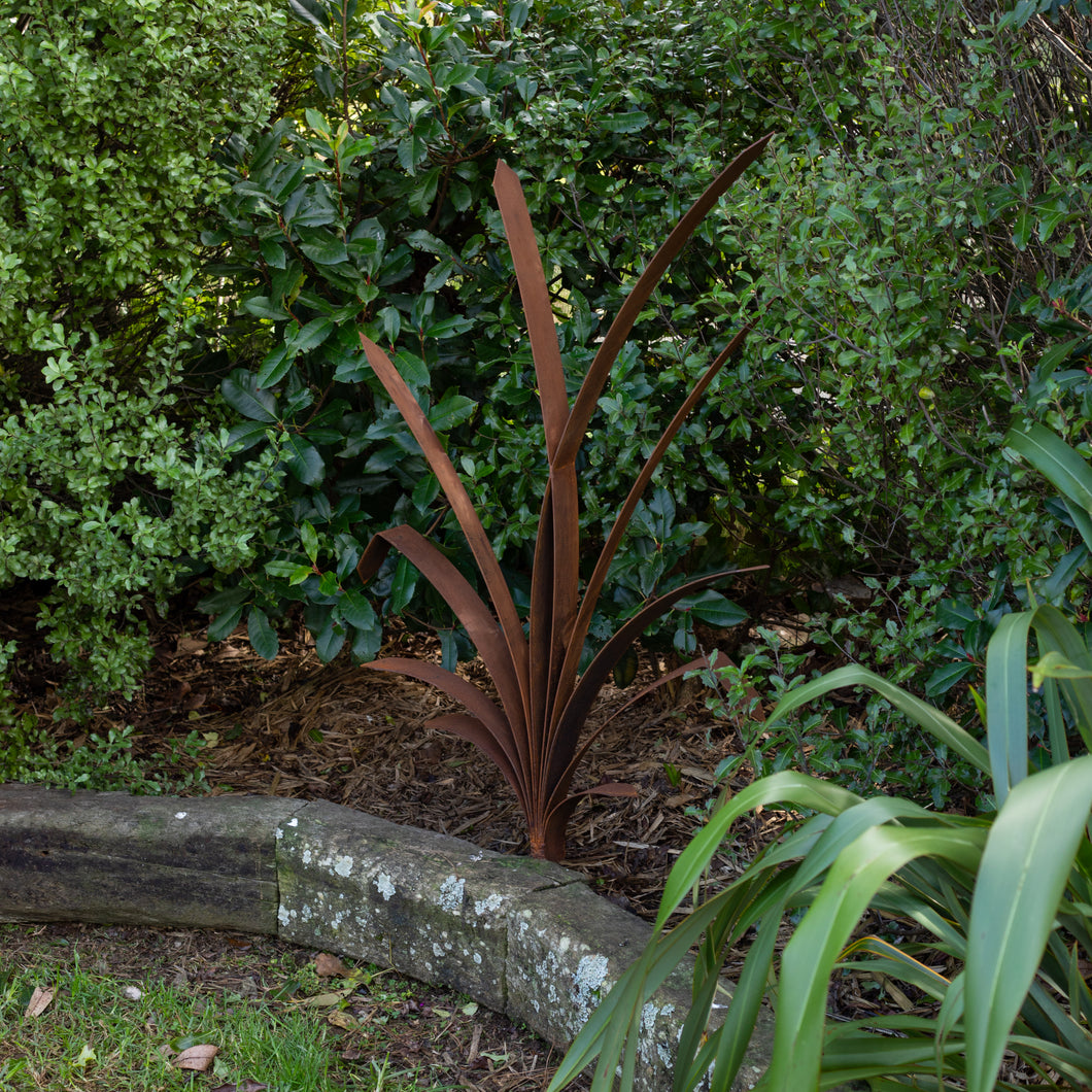 Our beautiful Corten "Flax" bush, sits beautifully in any garden setting! As with all our garden art, a long stake keeps it firmly in the ground, while the longer leaves move gently in the breeze.